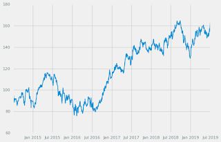 Vi tar utgangspunkt i et enkelt linjediagram basert på DNB-aksjen de siste 5 årene, datasett: